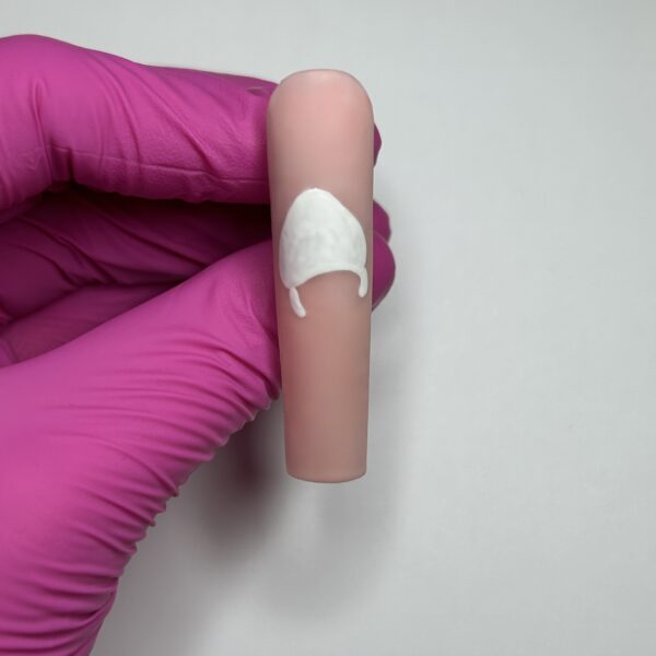Using the Angel shade, paint one long, straight ear and one flopped over. Cure, then paint the inside of the rabbit’s straight ear with Gems Gel Polish in Ellie-Jade. Cure.