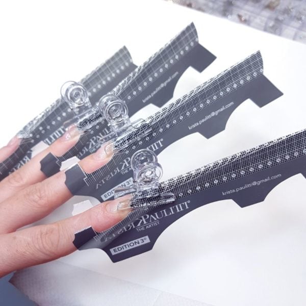 Prepinch and apply extreme nail forms, if needed cut the forms at hyponychium for better fit. Also cut at the lateral nail folds place so you can get better pinching. Prime the nails.
