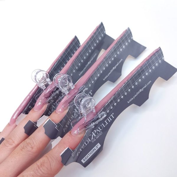 Ensure you pinch the nail in accordance to your chosen system and in line with training guidance. For this step-by-step, I cured half of recommend time and applied pinching clamps at the widest part of the enhancement. When working with gel, the pinching clamp should be clear in order to get proper cure.