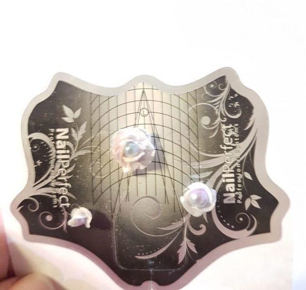 Using white acrylic powder create 3d roses with a pearl middle. When the roses are set, dip your brush in monomer followed by an aurora pigment and apply it on the edges of the petals.