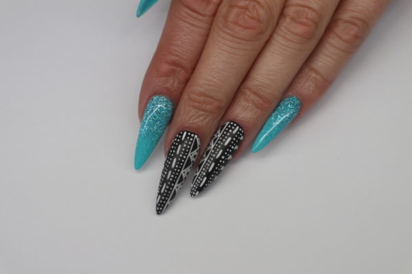 Create the geometric design using Just White Buttercream and the Stripy, Block and Swirly brush from Celina Ryden’s brush kit, along with the Light Elegance Stylus for the dot work. Cure for 30 seconds in LED (2 minutes in UV).