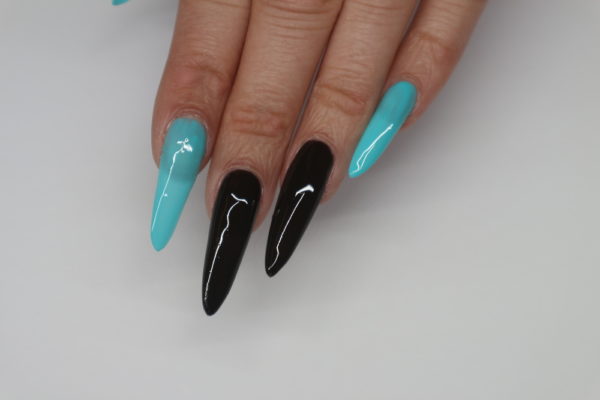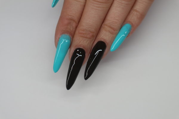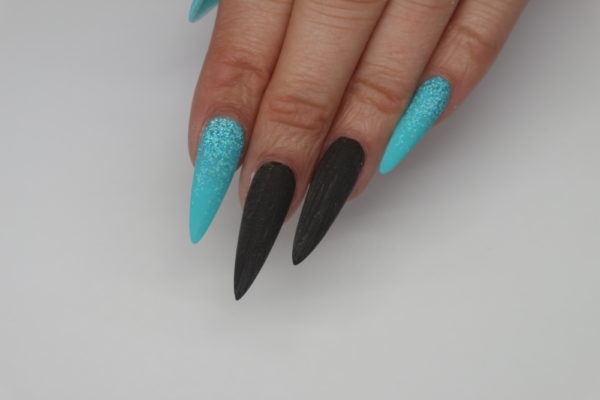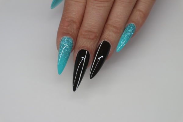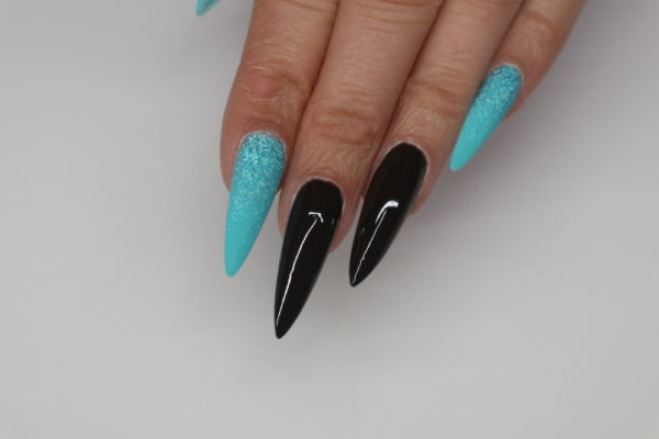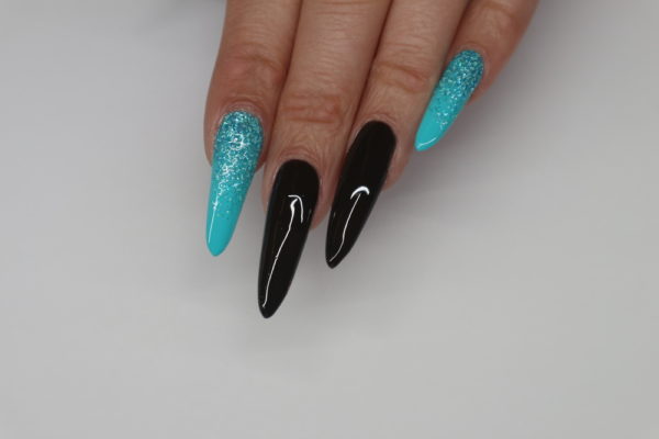 Use a separate Gel Polish Bling Brush to apply Light Elegance Maliblue glitter gel to the gap where you did not apply the second layer of colour. Then blend up the nail to create a glitter fade. Cure for 30 seconds in LED (2 minutes in UV).