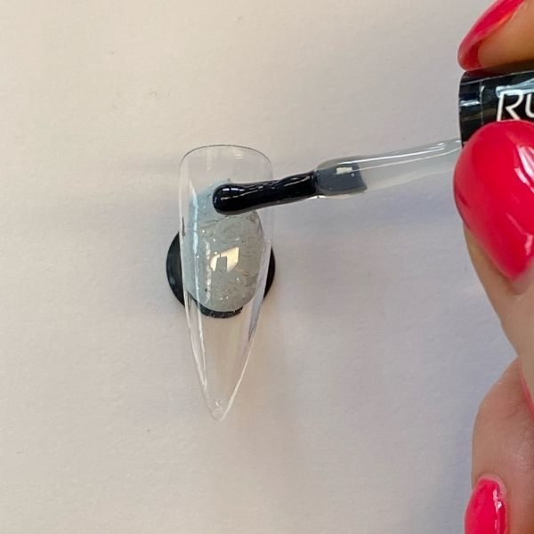 Apply Halo Gel Polish Rubber Base to a prepped nail and cure for 30 seconds. Make sure you use a clear tip or base layer for this design.