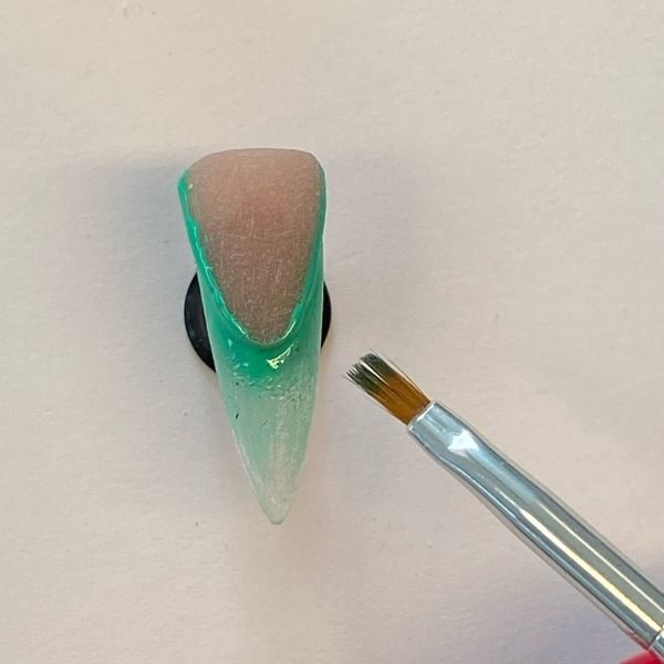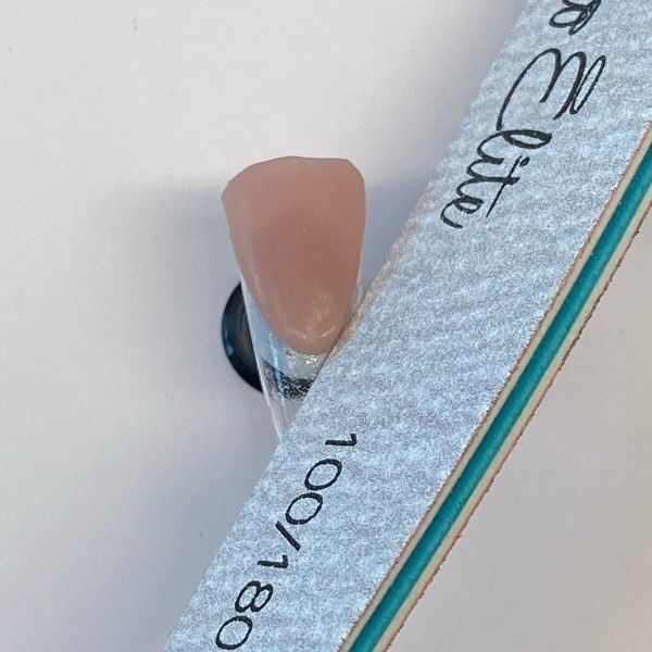 Apply Polibuild Precision Gel in the shade Nude as a reverse smile. Sharpen and refine the shape with your file.