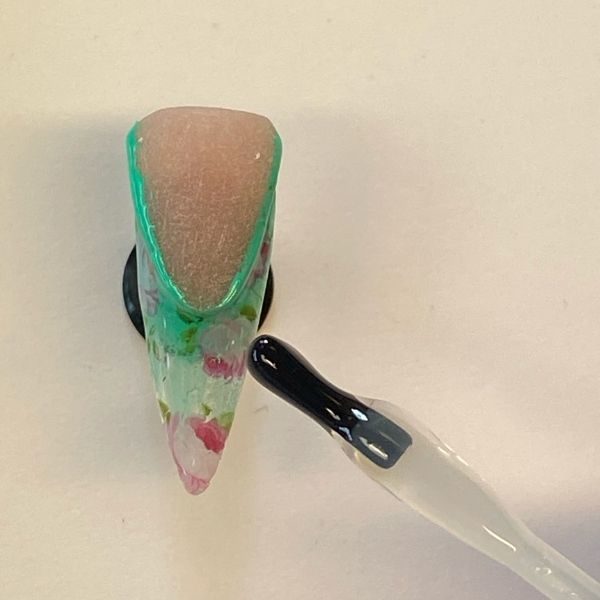 Remove the tacky layer and buff into shape. Any residue colour left on the surface area will be removed when you file. Apply Non Wipe Top Coat and cure for 30 seconds.
