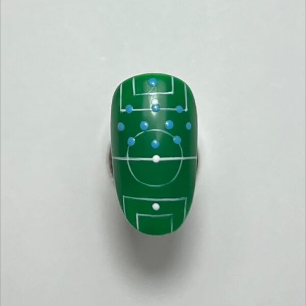 Using a dotting tool and your choice of gel paint (I chose blue), add 11 dots to create the formation of the first team’s players. Cure.