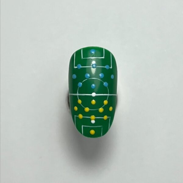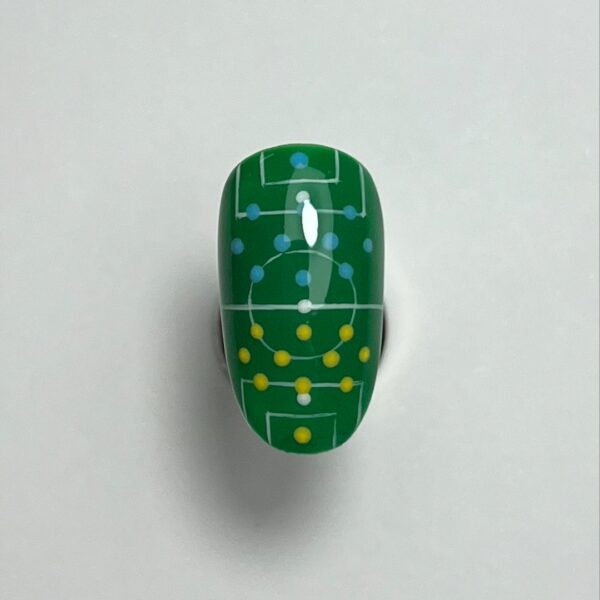 Using a dotting tool and your choice of gel paint (I chose yellow), add 11 dots to create the formation of the second team’s players. Cure.
