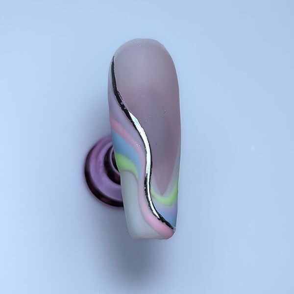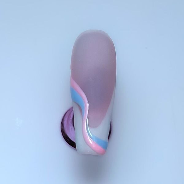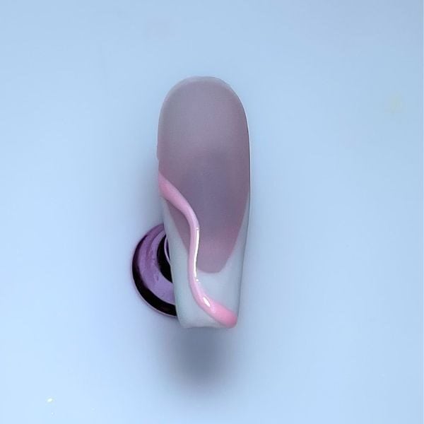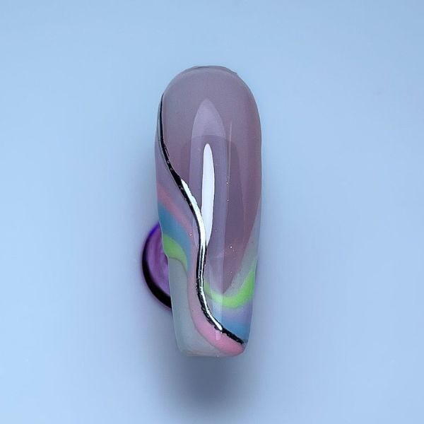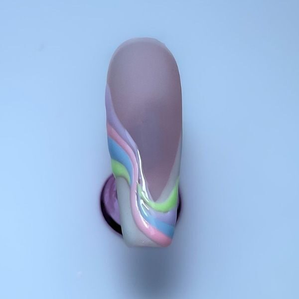 Apply matte top coat and cure. Taking your first colour and a striper brush, draw the first swirl and cure.