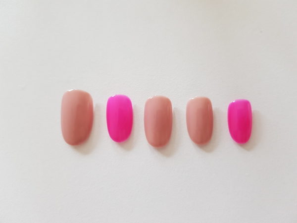 Apply a thin coat of GELLUX Bare Necessities to the thumb, middle and ring finger nails. Apply a thin coat of GELLUX Bubblegum Pink to the index and pinky finger, capping the free edge. Cure. Apply a second coat to all nails, capping the edges and cure.