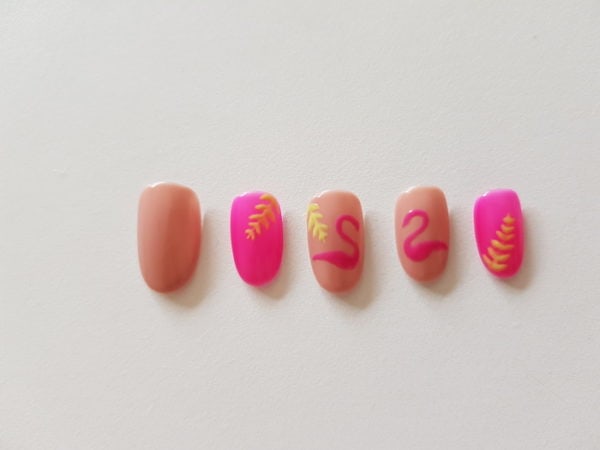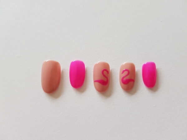 Using a small detailer brush, create flamingo shapes on the middle and ring finger nails using GELLUX Bubblegum Pink. Cure.