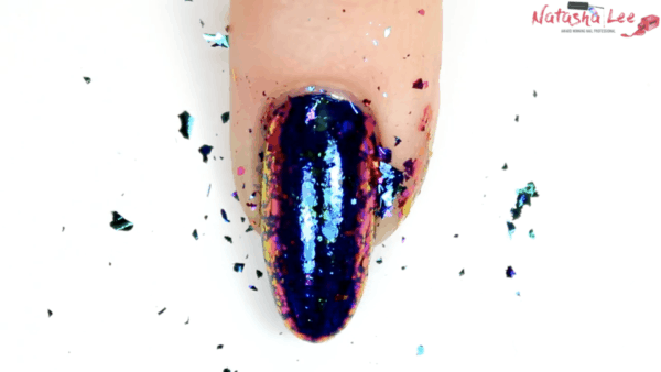 “The finished nails look complicated but the key is just to build it up in layers. You really don’t need to be particularly arty to achieve this look, just remember to add the detail in layers and leave enough of the base layer visible so that the beautiful chameleon flakes used capture the light.”