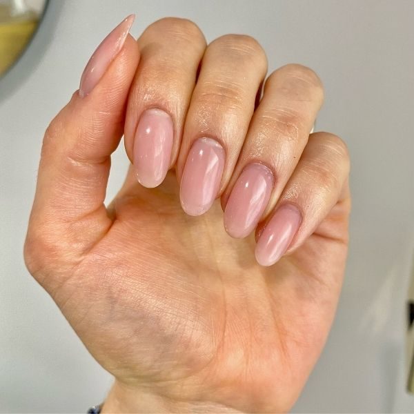 File the nails to shape, push the cuticles back and gently buff the surface of the nails with a white block. Thoroughly wipe nails with cleanser and a lint free pad. Apply a pink base coat and cure.