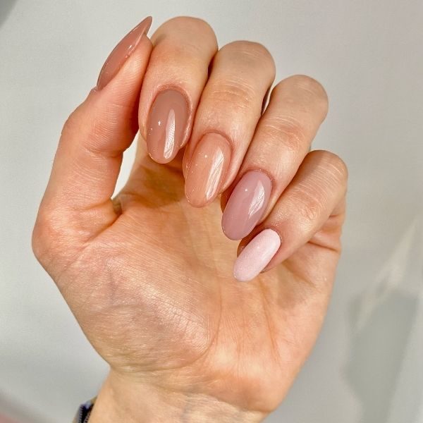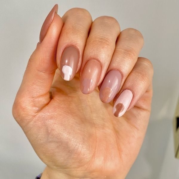 Apply two layers of gel polish on each finger, in a tonal pattern as shown. Cure in between layers.