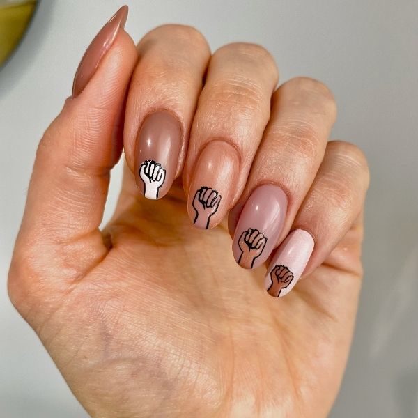 With a fine liner brush and black gel polish, paint details on the fists and cure.