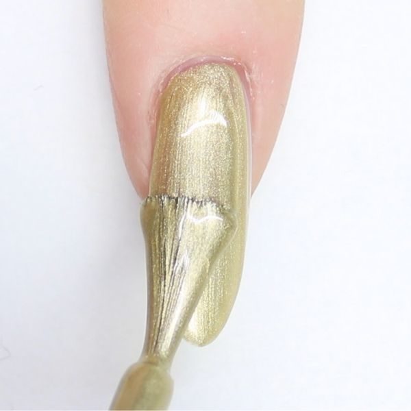 Apply base coat (if applicable with your preferred system), followed by a gold lacquer on the little finger.