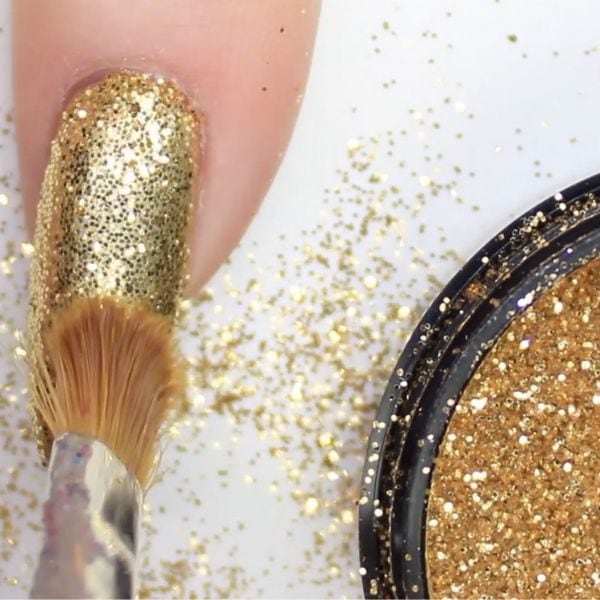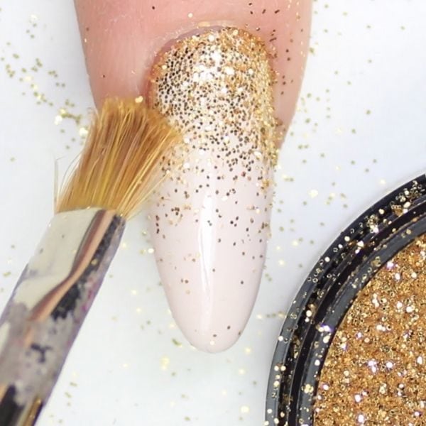 On the index finger, apply foil glue then gold glitter to the cuticle area only and brush towards the free edge of the nail to create a faded or graduated effect. Again, apply to the tacky layer if gel polish has been used.