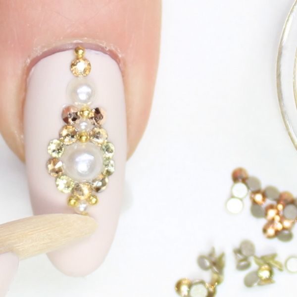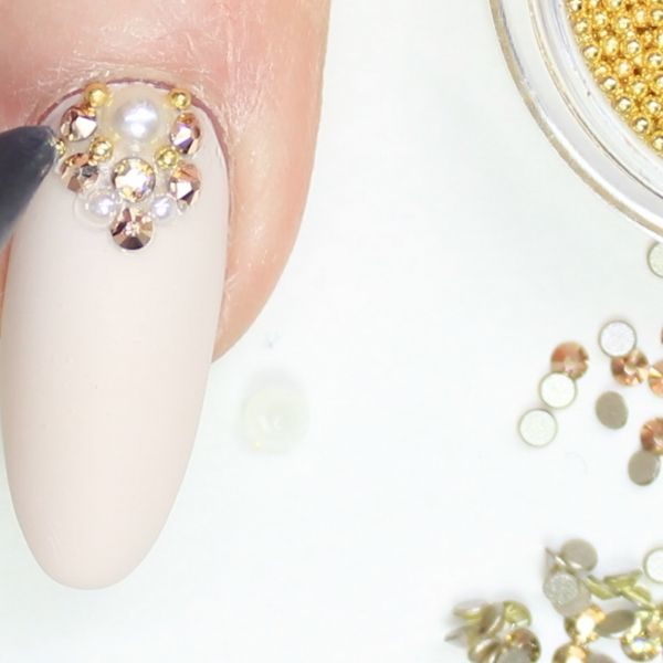 On the ring finger, apply a selection of flat-backed pearls, SS5 rose gold Swarovski crystals and gold caviar beads in a triangle shape from the cuticle area. It’s best to use a clear builder gel to set these decals so that they last, and add a thin layer of top coat on top of the decals to stop the surface scratching. Cure.