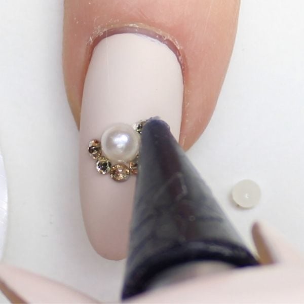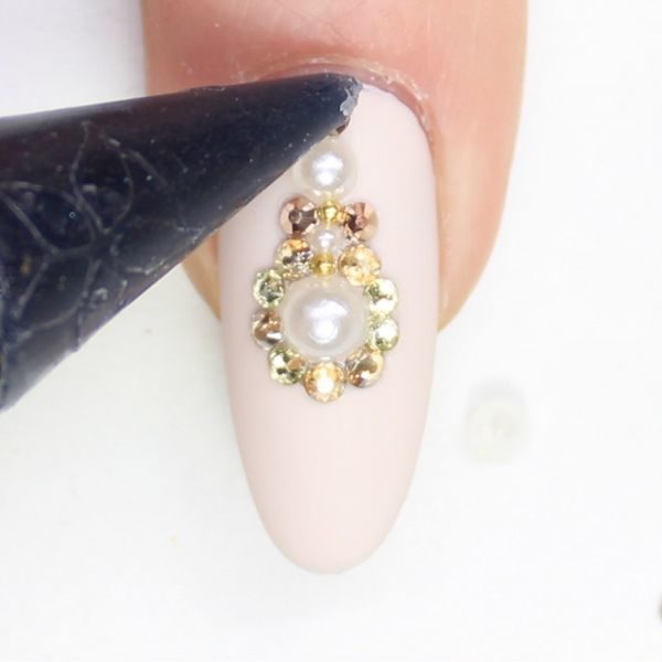 On the middle finger, apply a large flat backed pearl to the centre of the nail using builder gel and then apply SS5 crystals around it pearl to create a flowery effect. You can cure at this stage or wait until the end to cure the entire look.