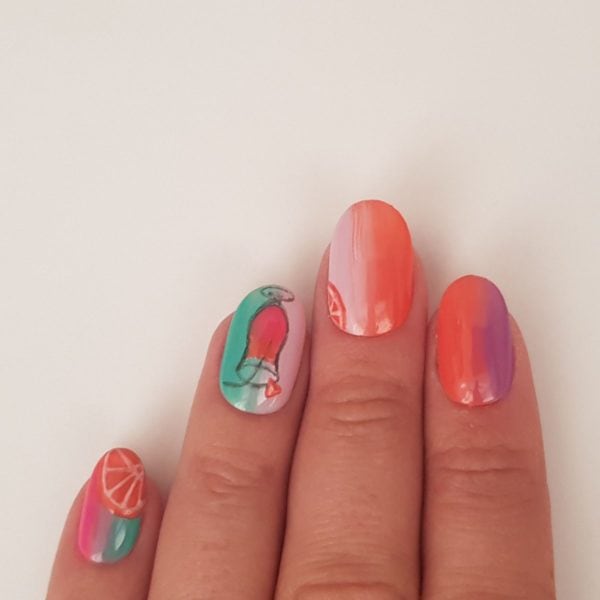 Using Gellux Boy Trouble, create an orange slice on the middle finger and pinky, also a small orange slice to decorate the glass. Cure.