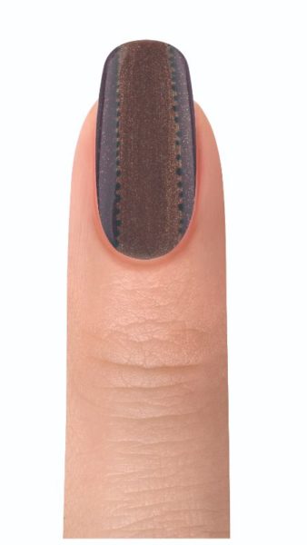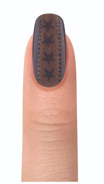 With A Girl And Her Curls and the Mini Striper Brush, paint four stars on top of That’s So Monroe. Cure for 30 seconds. Apply Top It Off to the entire nail making sure to cap the free edge. Cure for 30 seconds. With Nail Surface Cleanse and Wipe It Off lint-free wipes, cleanse the inhibition layer of the nail. Finish your look by massaging Nourish Cuticle Oil into the skin surrounding the nail plate.
