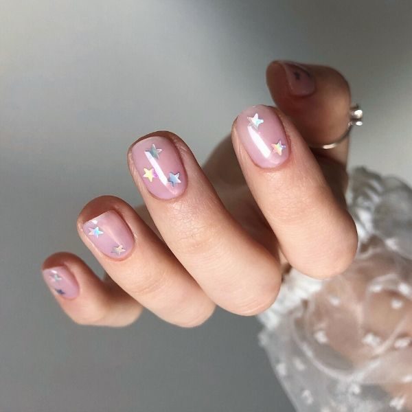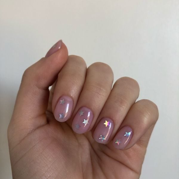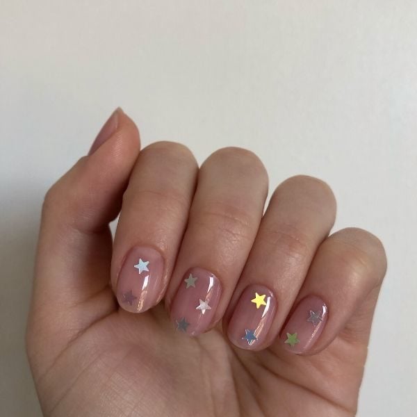 Using a pick-up tool, pick-up some holographic stars and drop them onto the nails one by one, cure again for 30 seconds.