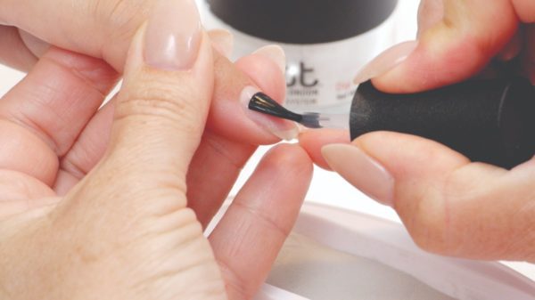 Apply Base, leaving a margin of 3mm from the cuticle. Always wipe the brush before replacing.