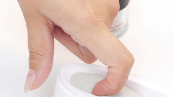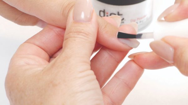 Dip the nail into either clear or coloured powder and tap off excess, or sprinkle over and remove excess with a brush.