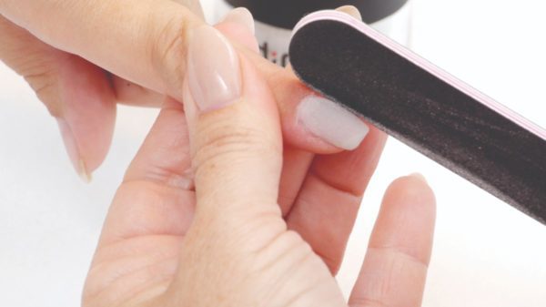 Prep the natural nail by removing the shine. Push back cuticles and remove any dead tissue. Remove dust with a lint-free wipe or nylon brush.