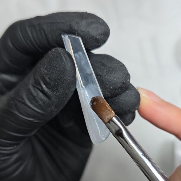 Apply a very soft layer of milky white gel on three quarters of the form and cure for five to 10 seconds.