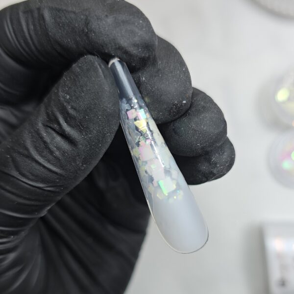 Apply milky white gel like in the second step and clear gel over the glitter, and apply the form gently on the natural nail without pressing too hard. Cure for 15 seconds.