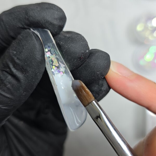 Apply a layer of clear gel on the rest of the extension and add your desired glitter, before curing for five to 10 seconds.