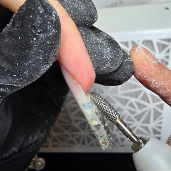 Remove the fast form, remove the inhibition layer on the underside of the extension and start shaping the sides and free edge. Using a corn-shaped metallic E-file bit or a pointed conic bit, remove the natural nail from underneath, being careful not to damage the hyponychium.