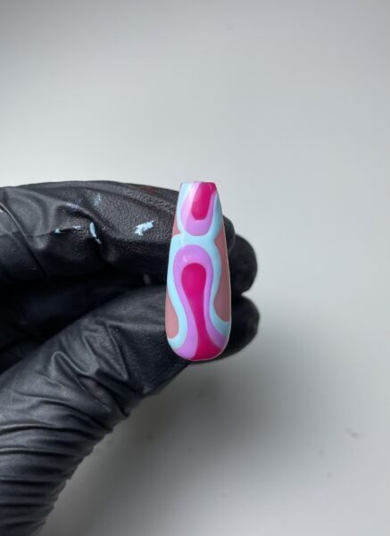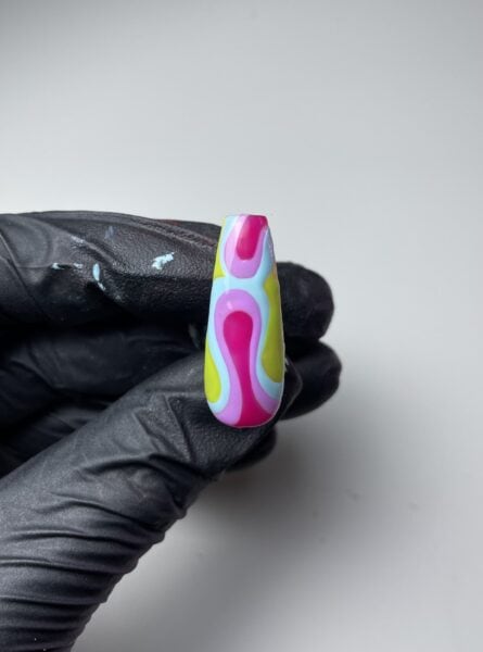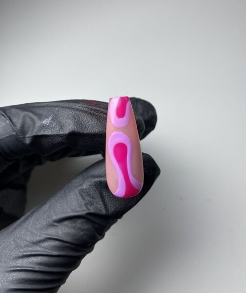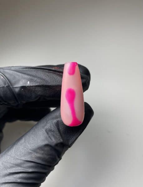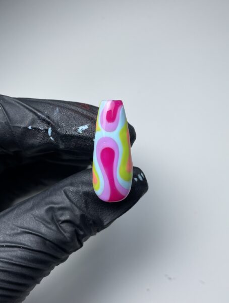 Outline the teardrop shapes in lines of varying thickness using Halo Gel Polish in Groovy Chick. This will give the effect of a lava lamp. Cure when happy with the result.
