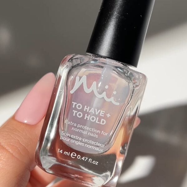 Apply a coat of Mii's To Have + To Hold Base Coat, following with a base shade if desired. I recommend Mii Colour Confidence colour, Naturally Modest, for this.