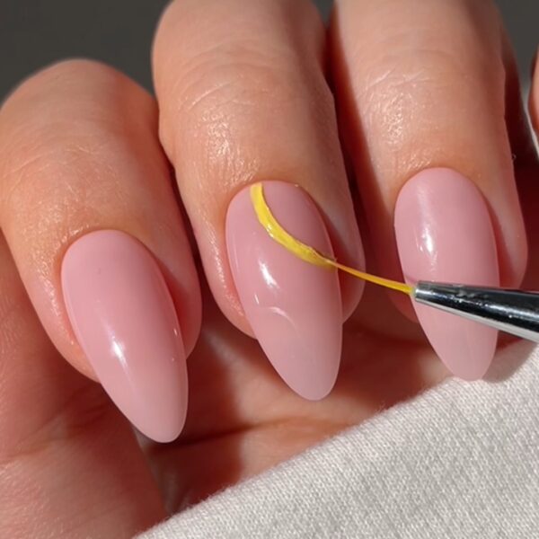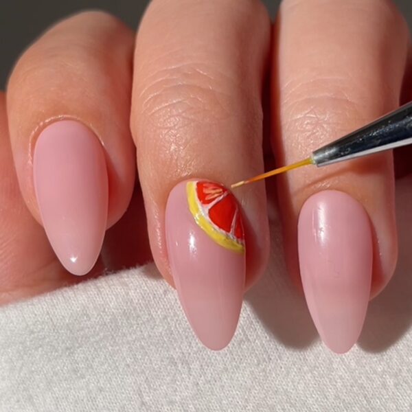 Use a nail art brush and yellow Colour Confidence hue, Bee A Keeper, to create a semicircle at the top of the middle and the ring fingernails. These are the outlines of the fruit.