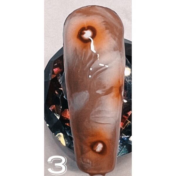Reapply blooming gel and add INK London iLac Gel Polish in i-218 (Maple), i-220 (English Oak) and Colour Gel Paint in White Lines to the nail as shown, using the INK London Pro Art Series Michelangelo liner brush.