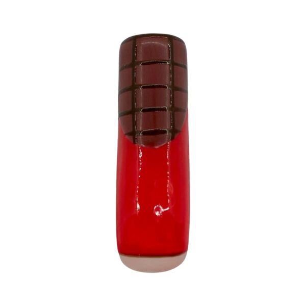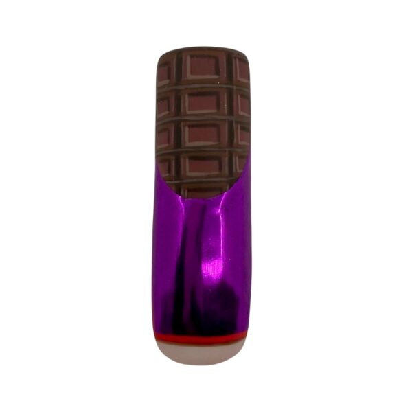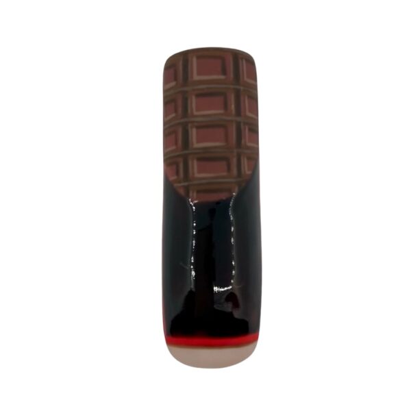 Map out the pieces of chocolate using a dark brown shade (created by mixing Brown and Black Gel Paints) and Nail Striper Brush, then cure to avoid smudging. Paint the wrapper shape using Red Gel Paint and cure.