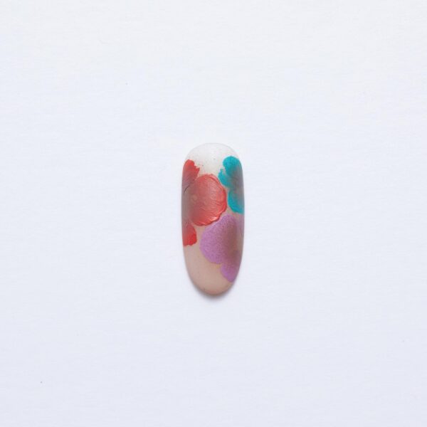 Airbrush AIRGEL's 85 colour in the centre of the flowers and flash cure. Top tip: if you want to soften the shades, spray a mix of AIRGEL Nail Color Liquid Dilution and the colour.