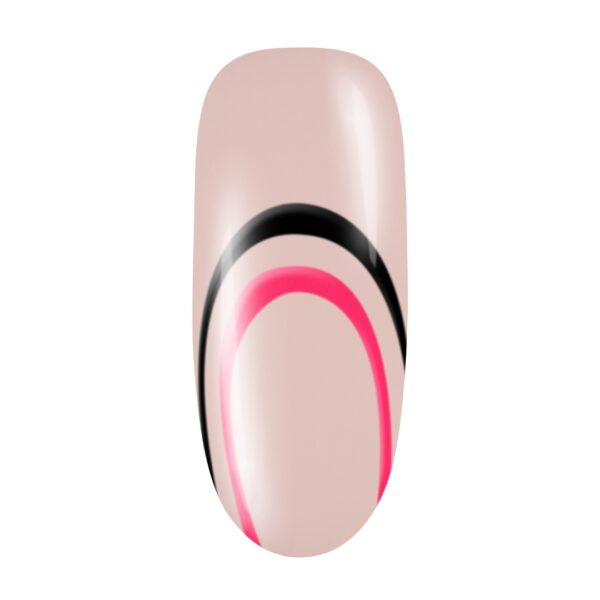 Dip a detail brush in Black Onyx/Lady in Black and create an arc starting on one side of the nail, arcing up and back down to the opposite side. Thicken the line at the centre of the arc, tapering thinner at the sides. Flash cure for five seconds.