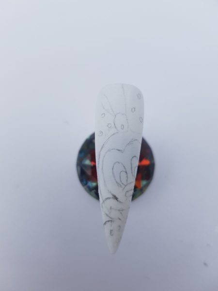 Apply two coats of Artistic Colour Gloss in Bride, curing each layer for 30 seconds. Apply two coats of Artistic Colour Glossing Top Coat, curing each for 30 seconds. Remove the inhibition layer and buff to create a matte surface. I prefer to work on a sealed polish, because if I make a mistake I can remove it, without disturbing the polish underneath. I also want a matte surface to work on, so I can sketch my design. Wipe over the nail with nail cleanser to remove any dust particles, and sketch your picture onto the nail. Ensure you have proportions equal.