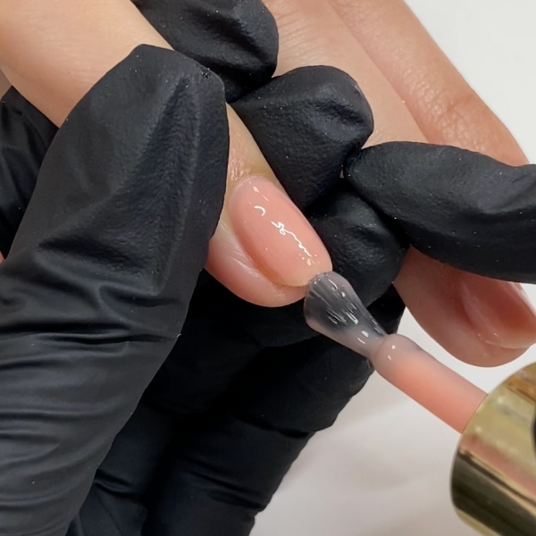 Apply one thin layer of Glitterbels Hema Free Builder-bel Gel and cure for 60 seconds.