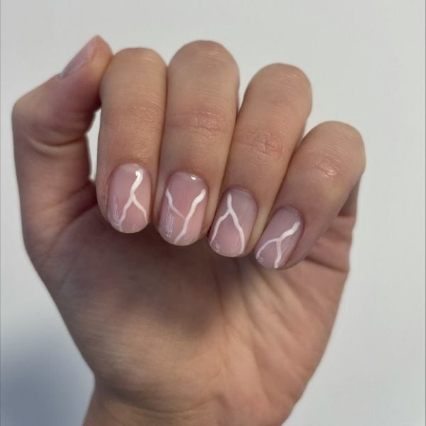 File the nails to shape, push the cuticles back with the GELLUX Cuticle Handy Manicure Tool and gently buff the nail plate with a white block. Thoroughly wipe nails with GELLUX Nail + File Cleansing Spray and a lint free pad. When the nails are dry, apply GELLUX Fast Bond and let it dry for 30 seconds. Then, apply one very thin layer of the GELLUX Builder Gel in Light Pink and cure. Using a fine liner and GELLUX Purely White, paint some wiggly line onto each nail. Do not cure.