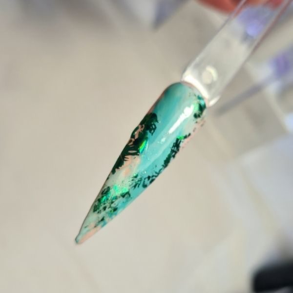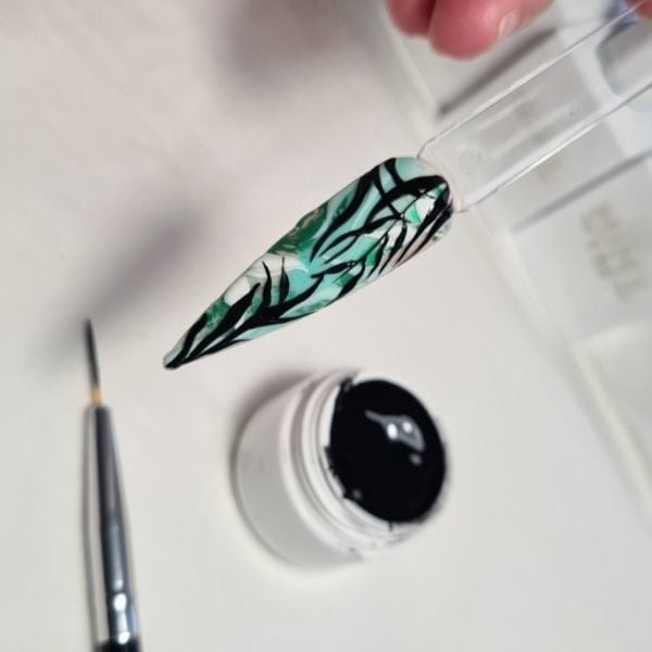 Using Mint Tint Art Gel in the shade Black with a longer detailer brush, paint more foliage over the whole design, making sure you see some of the earlier design coming through as background. When you are happy, cure for 90 seconds then apply Mint Tint Shiny Non Wipe Topcoat to finish your jungle nail design. To finish the look, cure for 60 seconds.