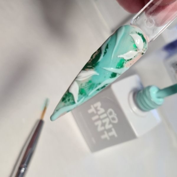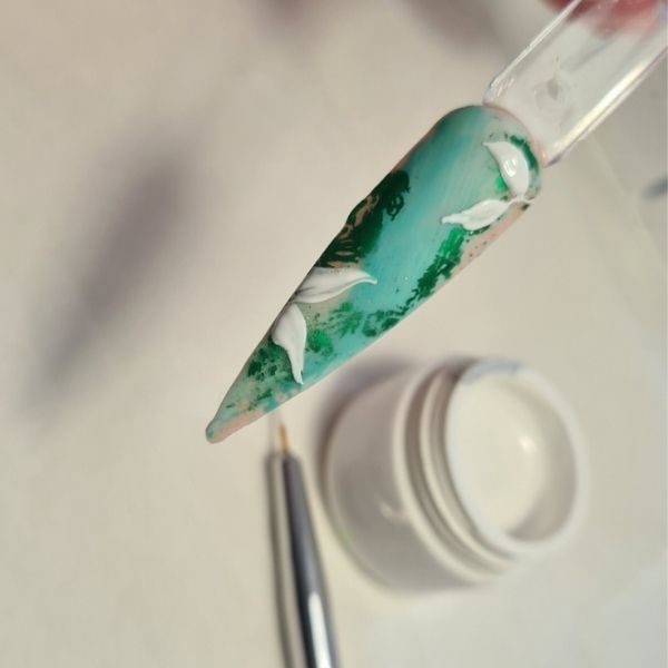 With a detailer brush, use Mint Tint Art Gel in White and Colour Gel in Love Bug to paint some foliage, spacing them out around the edges of nail. Cure for 90 seconds.