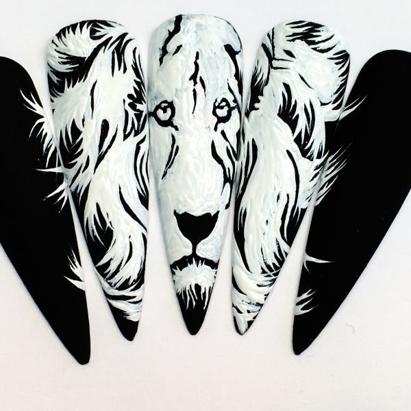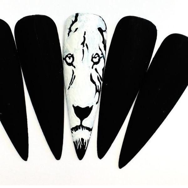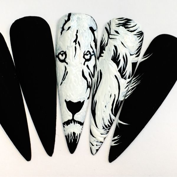 Take the Fine Liner Brush from Urban Nails to paint in the detail of his face. Then use White Liner Gel from Urban Nails to paint the Lion in white.