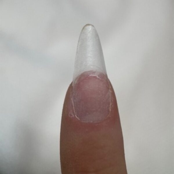 Prep the natural nails by buffing and filing gently, then apply the Glitterbels Extreme Coffin Tips. Once the tips are secured with the Effortless Adhesion Glue, cut and file the tips into long almond shapes. Apply Dehydrator and Acid Free Primer.