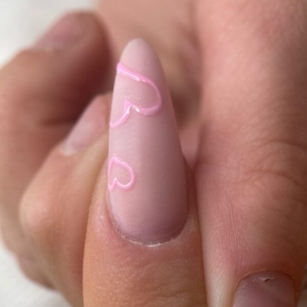Alternating between block colour hearts and outlines gives the design a cute and textured look. A top tip for this type of nail art is to layer the hearts. Add top coat and cure to finish.