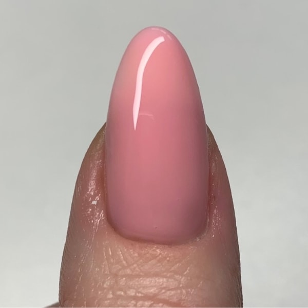 Prep the nails. File to shape, push back the cuticle and buff the nail plate. Prep nails for gel application and apply two coats of a pink builder gel for the base, curing between each layer.