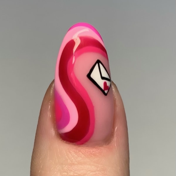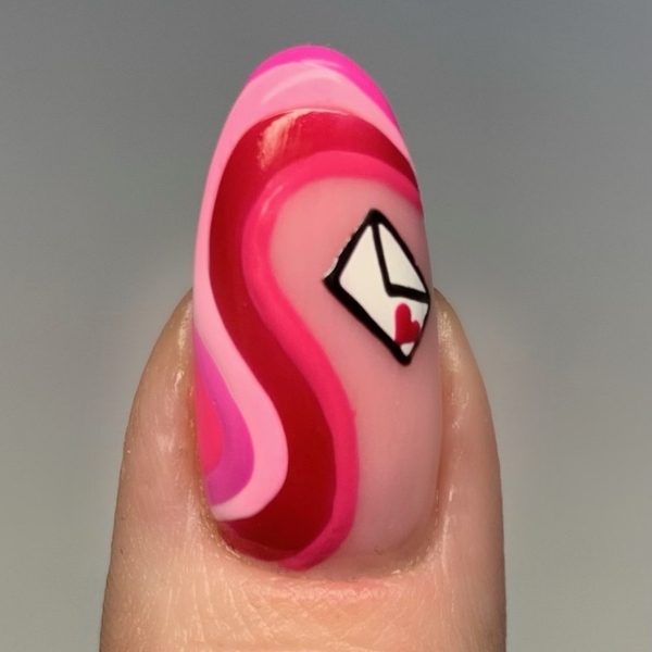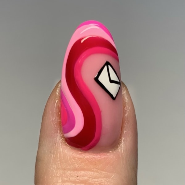 Using a dotting tool and one of the pink gel polish hues previously used, apply two dots close together near the edge of the envelope. Then, use a thin art liner brush to drag the dots down, creating a tiny heart. Cure.