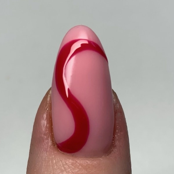 Using a liner art brush, apply a cherry gel polish, creating a swirl design. Cure.